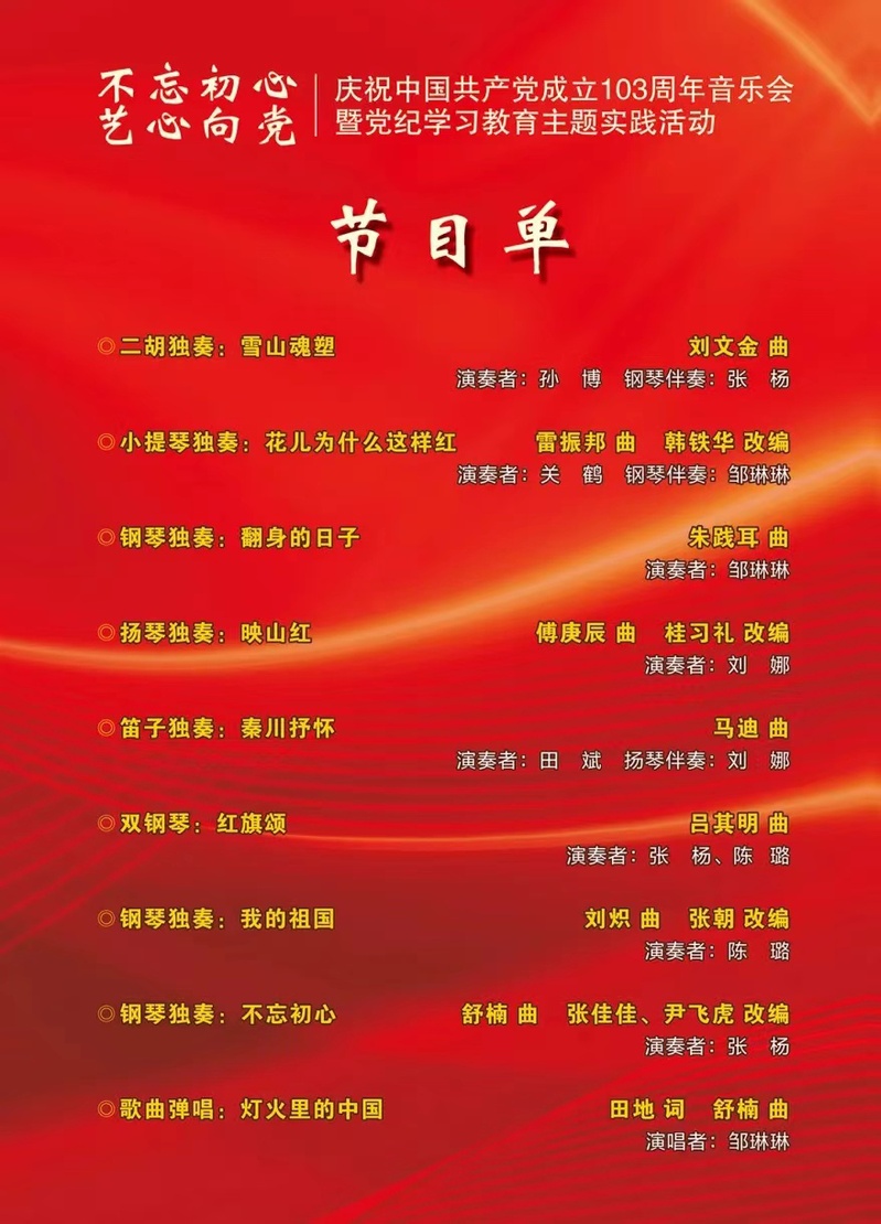 音乐会预告: “不忘初心 艺心向党”庆祝中国共产党成立103周年音乐会暨党纪学习教育主题实践活动